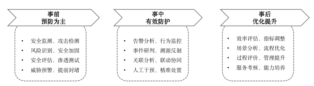 安全保护措施应覆盖关键信息基础设施的规划设计、建设实施、运行使用全生命周期过程,安全运营流程的建立能够在各环节实现业务与安全工作的结合,在各阶段以合规与风险视角,结合业务场景,开展安全要素同步介入工作,在业务与安全之间建立更紧密、更直接的联系。