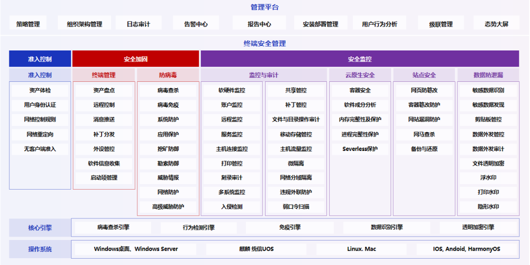 主机监控与审计能力:以主机管理为核心,形成集主机监控与审计、补丁管理、运维管理等为一体的主机审计系统,为企业管理者提供内网主机统一管理解决方案,最大程度杜绝终端违规操作,帮助使用者创建一个安全、可靠、稳定、合规的内网办公环境。