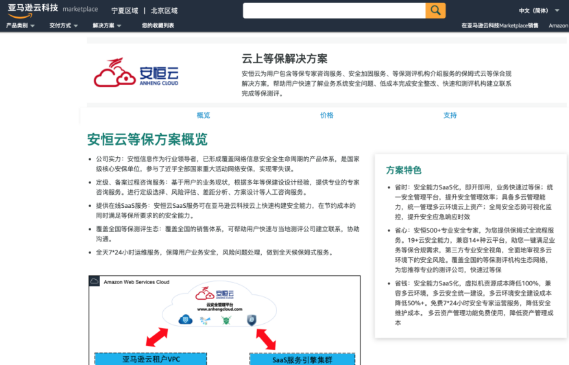 安恒信息云安全自2019年起,与亚马逊科技全面合作,安恒云在线SaaS订阅服务2021年入驻亚马逊科技marketplace,是第一批入驻的SaaS解决方案,也是唯一一个SaaS云安全解决方案,安恒云等保解决方案也是亚马逊marketplace等保2.0解决方案推荐解决方案之一。