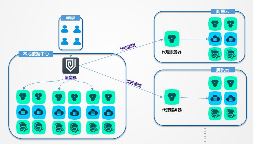 支持socks5、ssh等加密代理协议连接管理异地云资源区中私有网络的云主机,解决云上无法统一管理问题。