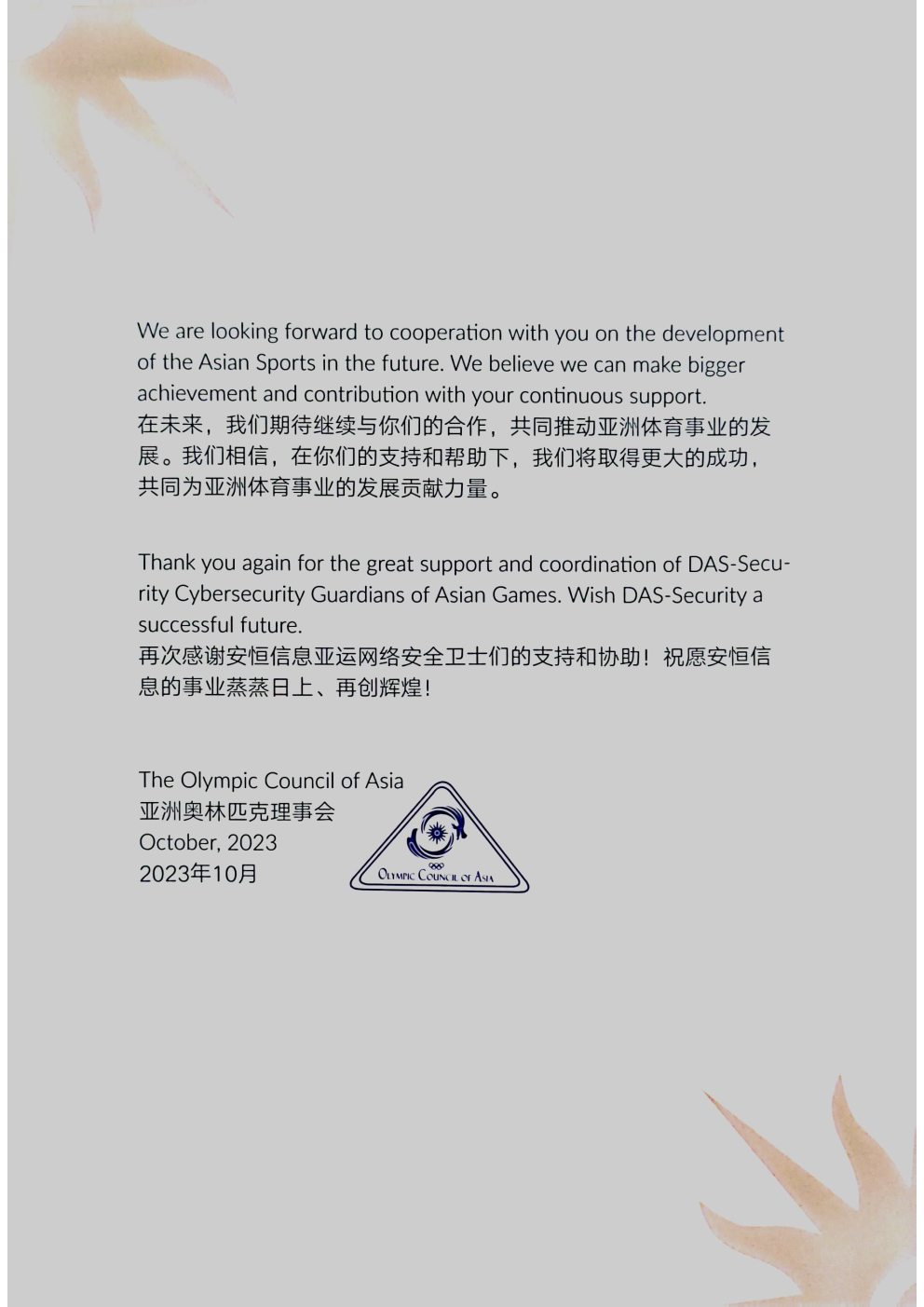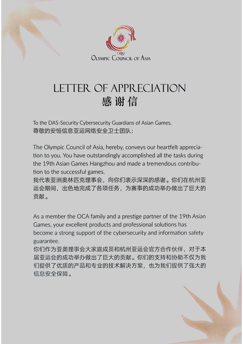 为亚洲体育事业贡献力量!安恒信息收获亚奥理事会感谢信